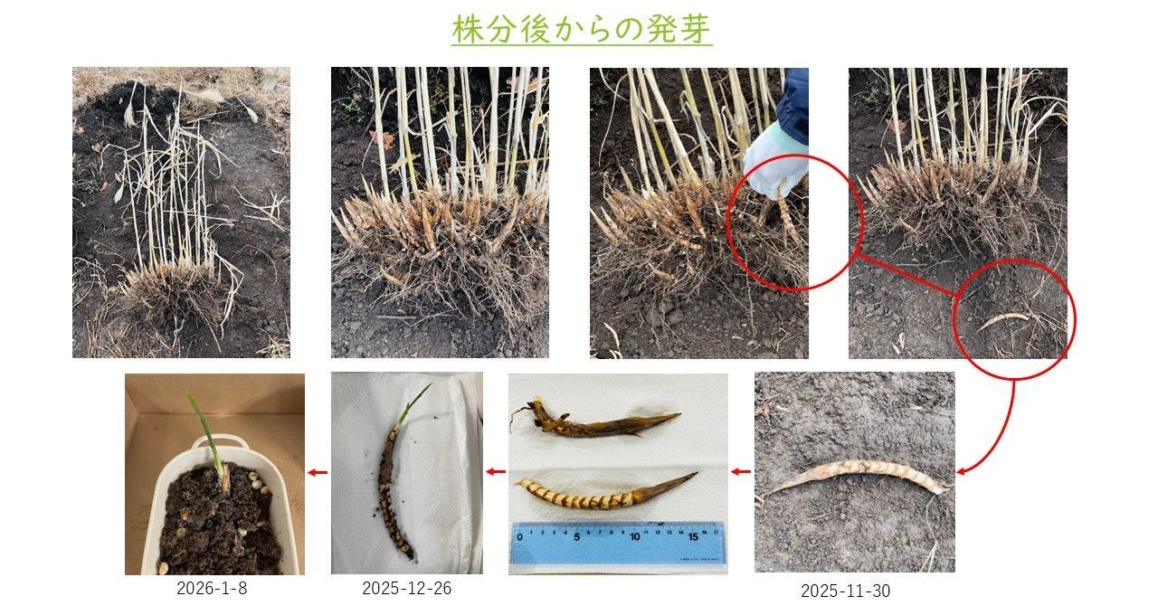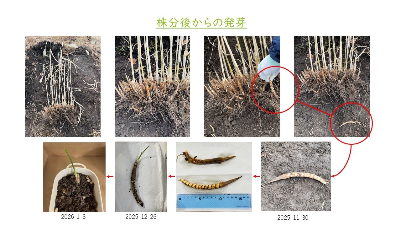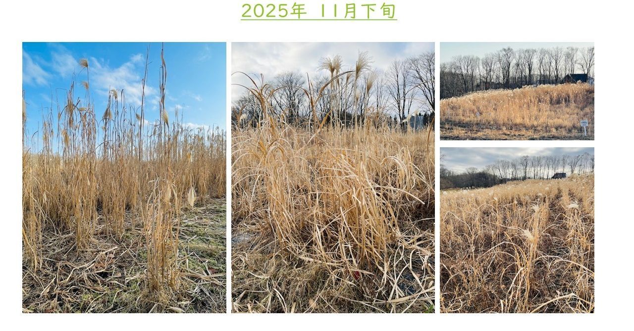ジャイアントミスカンサス成長記録 2024年6月 2024年夏季 2024年秋季 2025年冬季 2025年5月 2025年6月 2025年7月 2025年8月 2025年9月 2025年10月 2025年11月 2025年12月 2026年01月 栽培概要 栽培地: 北海道阿寒郡鶴居村下幌呂栽培作物: ジャイアントミスカンサス (既存品種・新品種)栽培数: 約6,000株栽培面積: 約1.5ha 2024年6月定植 ジャイアントミスカンサスの苗 2024年夏季 2024年秋季 2025年冬季 2025年5月越冬成功 2025年6月 新芽 2025年7月 2025年8月 2025年9月 2025年10月 2025年11月 2025年12月 2026年01月